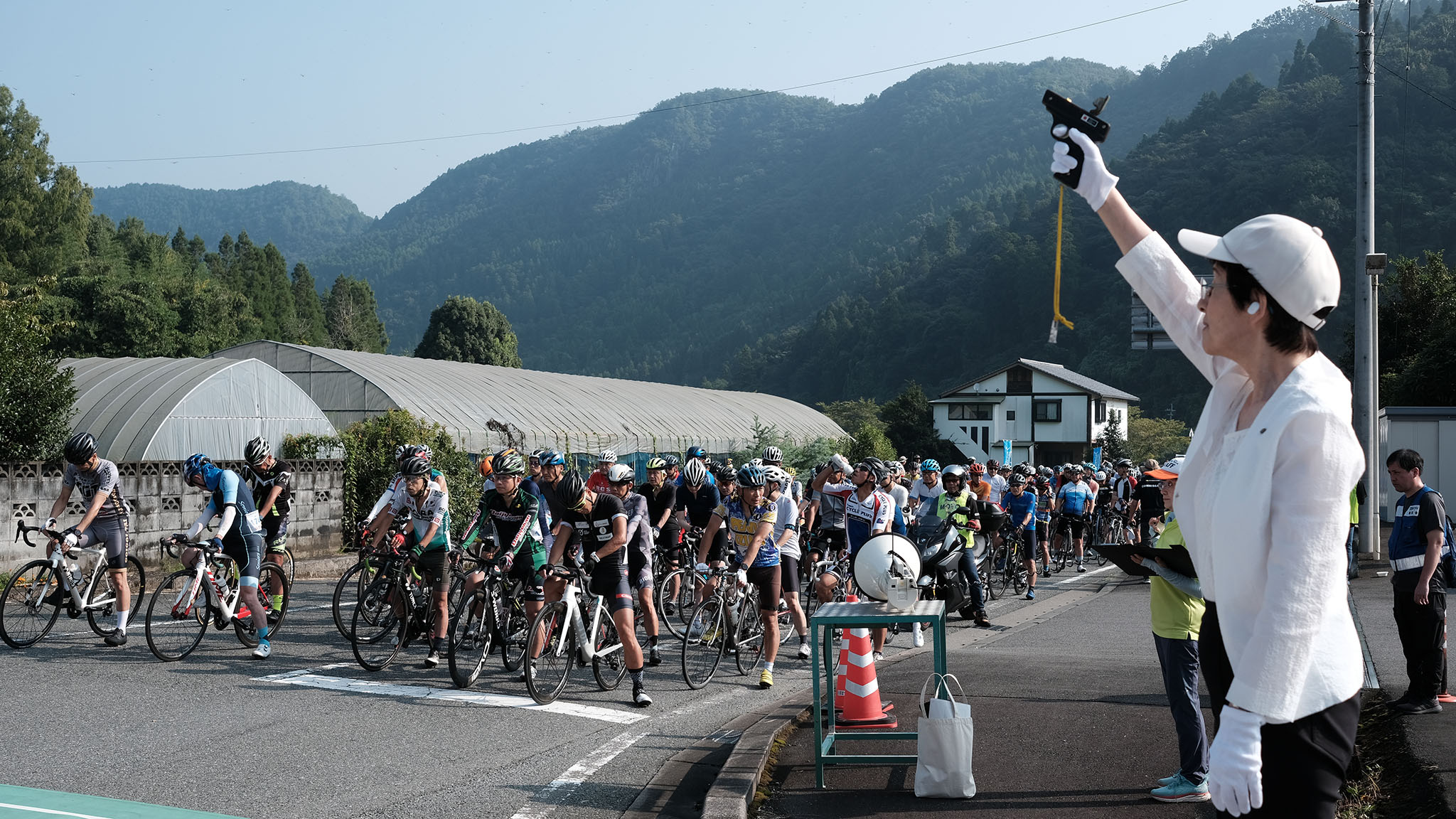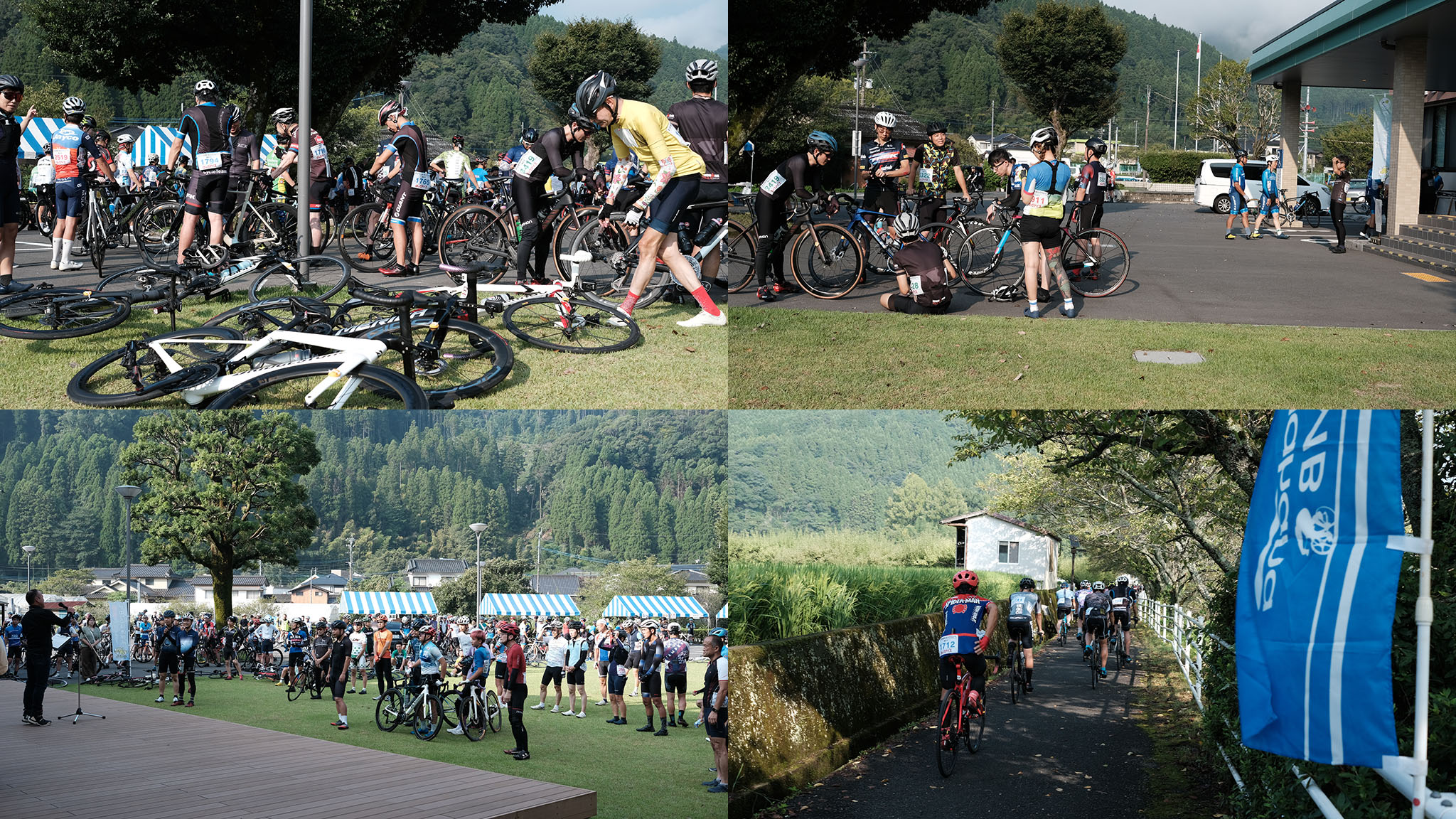 この日は椋野美智子・日田市長をはじめ地元選出の県会議員、地元の市会議員の皆さんも来席し、選手たちにエールを送ります。中にはスタート直前までバイクの設定に余念の無いサイクリストも大急ぎで手を動かします。それぞれのレースがいよいよ始まりです。開会式を終えた選手たちは大山川沿いのサイクリングコースを移動してスタート地点となる大山町・中川原交差点へ。