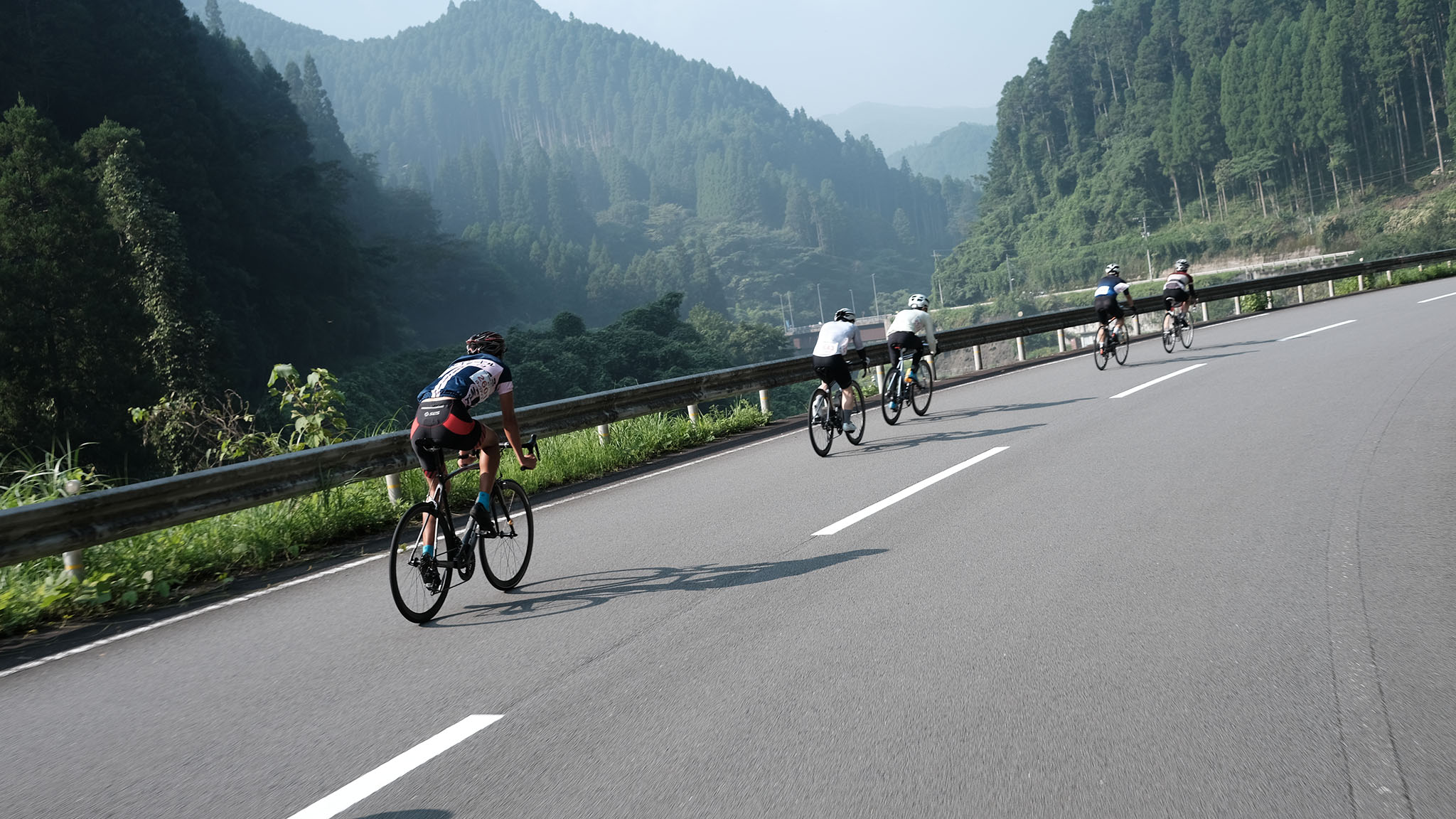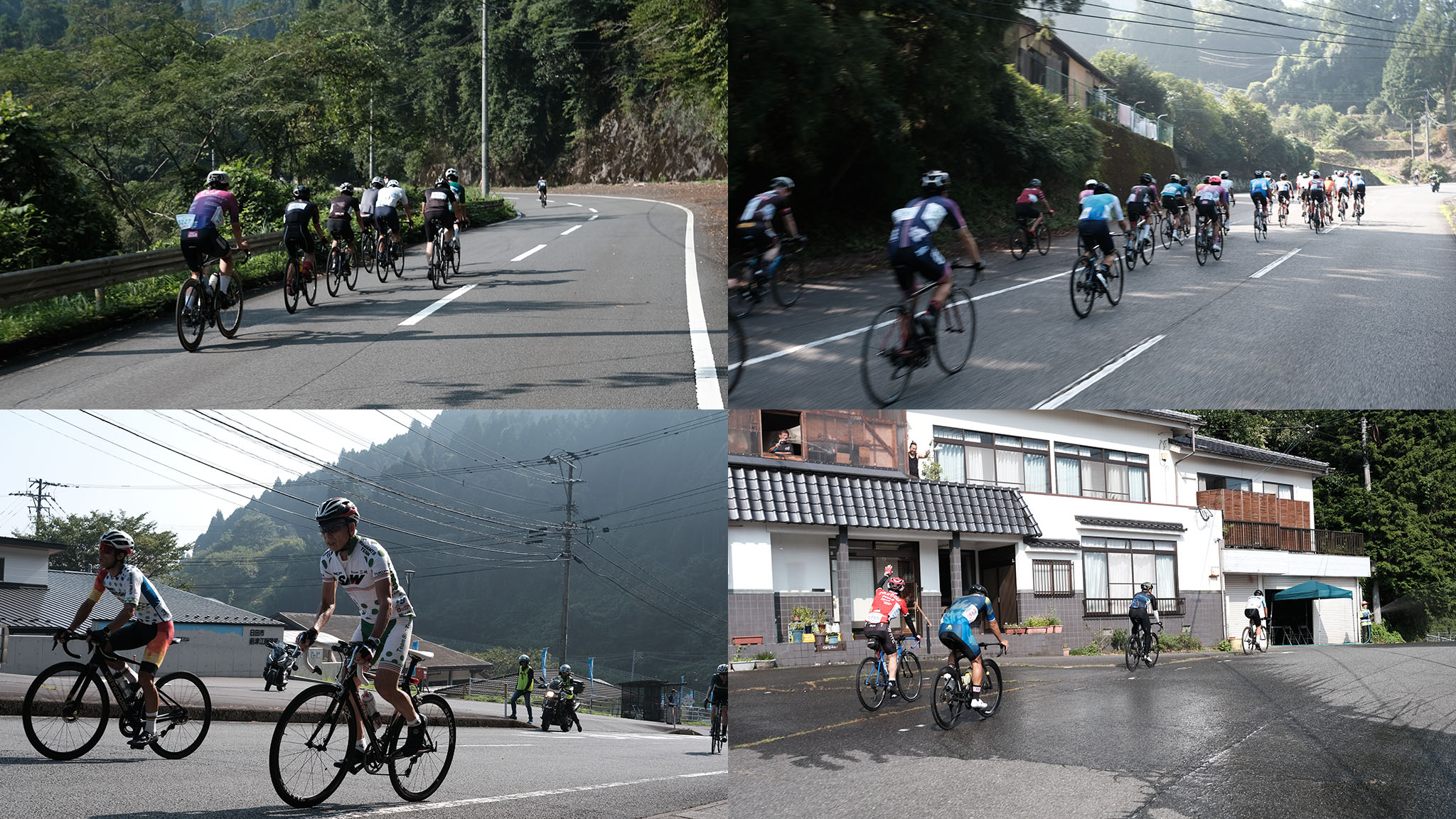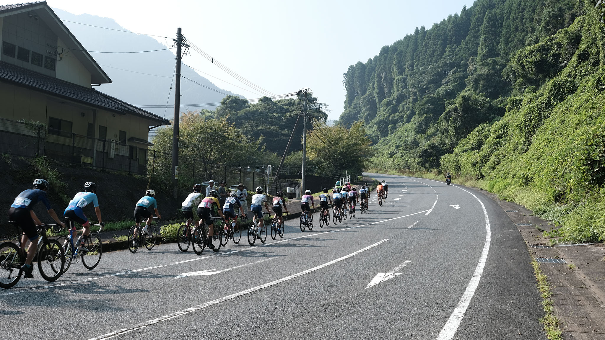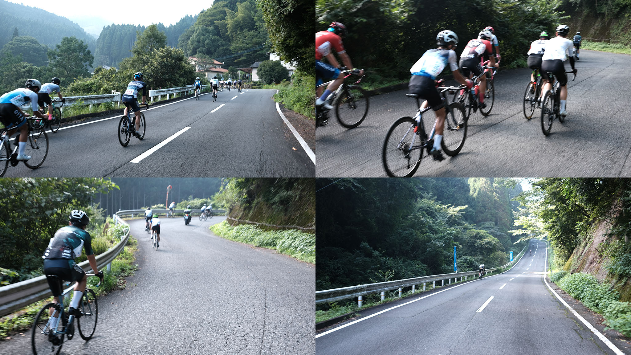 大山町を抜けてトンネルをくぐったら、そろそろ雰囲気がピリピリし始めます。いよいよヒルクライムの本番エリア、前津江町の急峻な地形が選手たちをお出迎えです。この辺までは大きなグループを形成していた集団もバラけ始め、ひとり抜け出す健脚もちらほら。