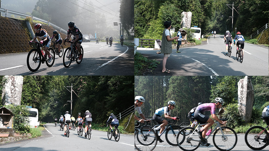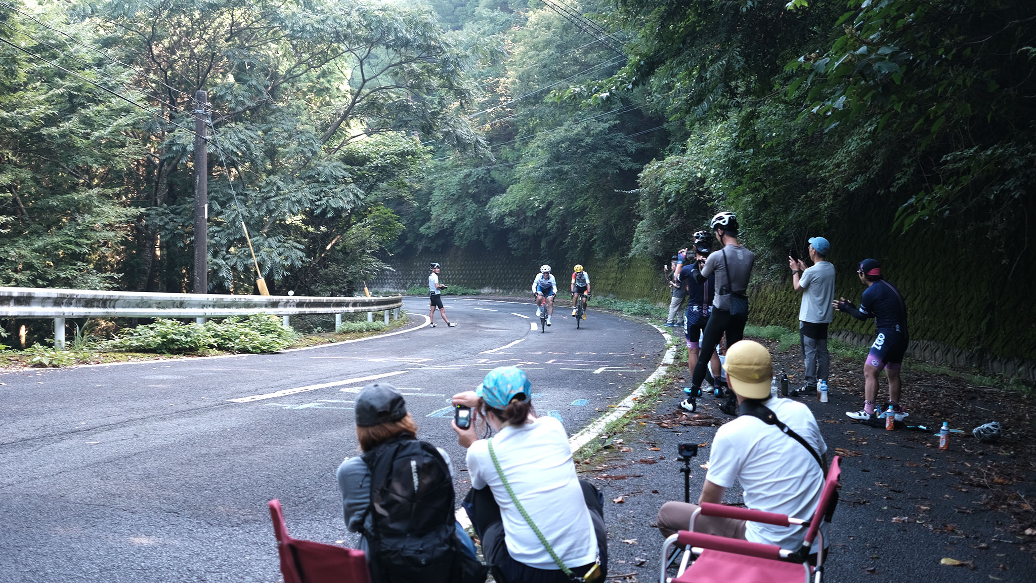 一気に人影や声援もまばらとなり、いよいよヒルクライムの核心部分へサイクリストたちは突入します。大きな集団を形成していたグループもすっかりばらけてしまい、4〜5人ずつの小集団となって一気に急坂を駆け上がっていきます。この辺のスリリングな抜きつ抜かれつも密かな楽しみ。