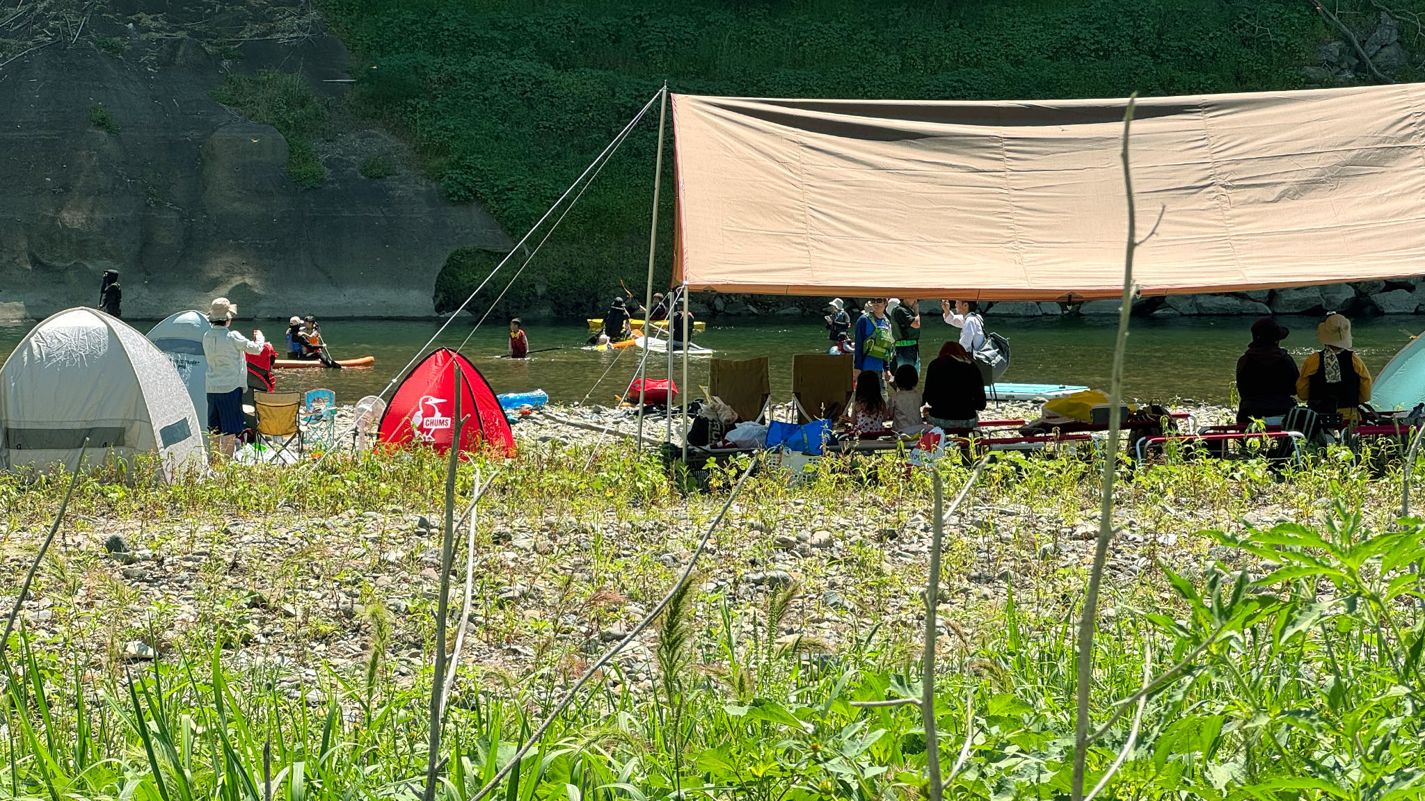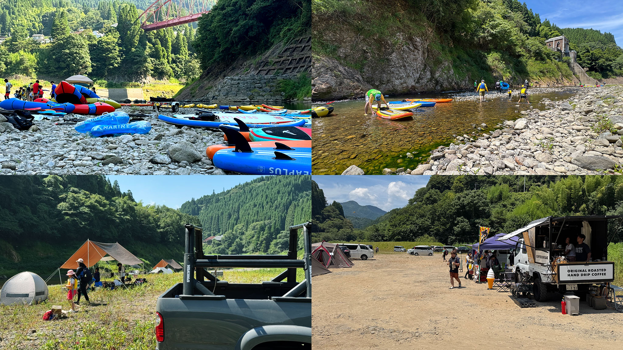 岸辺には休憩スペースを兼ねたタープエリアがスノーピーク奥日田キャンプフィールドのスタッフにより設けられ、地元の人気カフェや食事処がポップアップで軒を並べます。朝から夕方まで奥日田ブルーを満喫!ということで、この日も予約一杯の100名ほどの参加者で賑わいました。