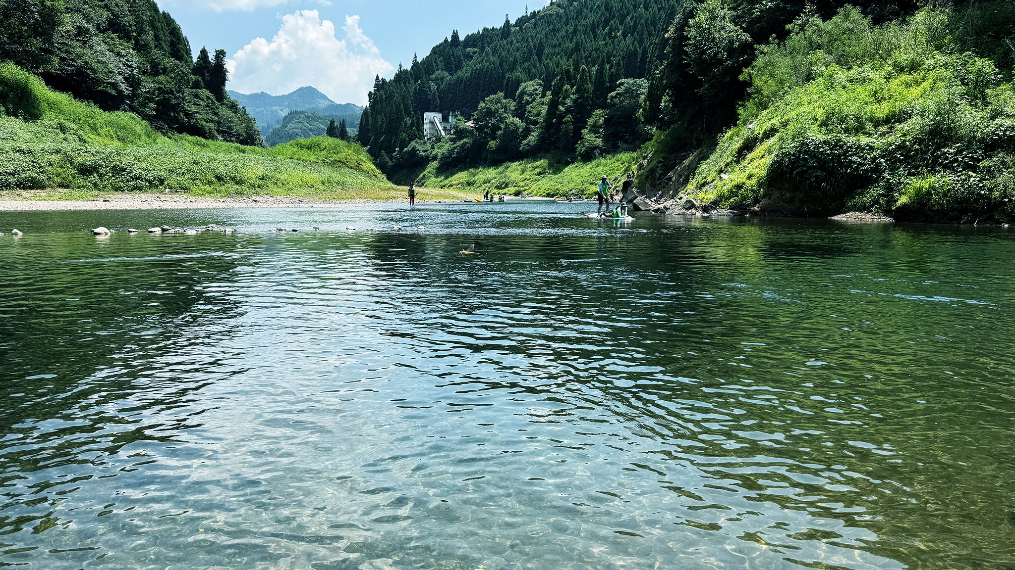 夏真っ盛りの奥日田で2025年8月3日に「奥日田ブルーピクニック」が開催されました。筑後川の源流をなす奥日田の水辺にもっと親しんでもらおうと地元有志によって2023年からスタートしたイベントです。フィールドとなるのは日田市中津江村の下筌ダム湖岸、通称栃原グラウンドに集合です。ダム湖への流れ込みエリアを利用したフィールドだけあって、水の透明度はなかなかのもの。スタッフは「これが奥日田ブルーです」と胸を張ります。